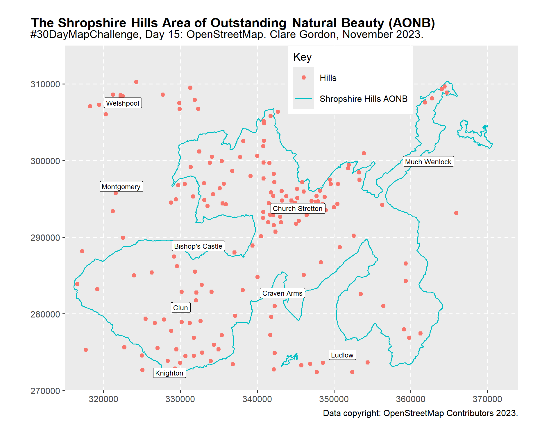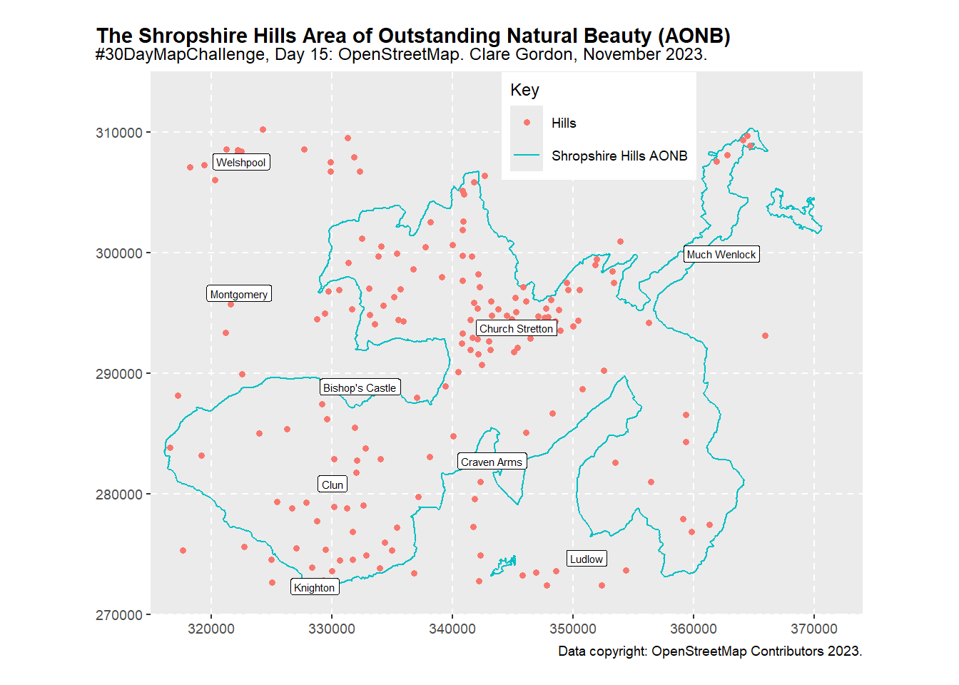 aonb_plot <-ggplot() +geom_sf(data = aonb_boundary$osm_lines,aes(colour ="Shropshire Hills AONB"))+geom_sf(data = peaks$osm_points,aes(colour ="Hills"))+geom_sf(data = places$osm_points,colour ="blue")+coord_sf(crs =st_crs(27700), xlim =c(315000, 374000), ylim =c(270000, 315000),datum =st_crs(27700), expand =FALSE)+geom_sf_label(data = places$osm_points, # Controls labels - in this case place names.aes(label = name), # field for the labelslabel.padding =unit(0.7, "mm"), # padding around the text - ie the white bitsize =2, # size of text - no idea what the units are!fill ="white")+labs(x =NULL, y =NULL, color ="Key",caption ="Data copyright: OpenStreetMap Contributors 2023.") +ggtitle("The Shropshire Hills Area of Outstanding Natural Beauty (AONB)", subtitle ="#30DayMapChallenge, Day 15: OpenStreetMap. Clare Gordon, November 2023.")+theme_grey(base_size =9) +# if don't set a theme, don't get coordinate grid...theme(plot.title.position ="plot",plot.title = ggtext::element_textbox_simple(face ="bold"),legend.position =c(0.63, 0.9),plot.margin =unit(c(0.5, 0.5, 0.5, 0.5), "cm"),panel.grid =element_line(color ="white", linewidth =0.4, linetype =2))# print the plotaonb_plot